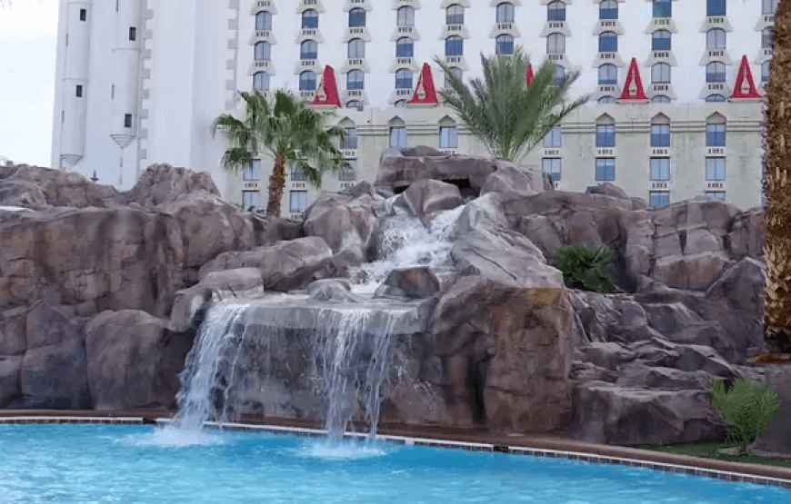 Excalibur, named for the mythical sword of King Arthur, uses the Medieval theme in several ways. Its facade is a stylized image of a castle (see also: List of castles in the United States). Until 2007, a wizard-like figure representing Merlin looked out from a high turret (since replaced by a figure advertising Dick’s Last Resort).