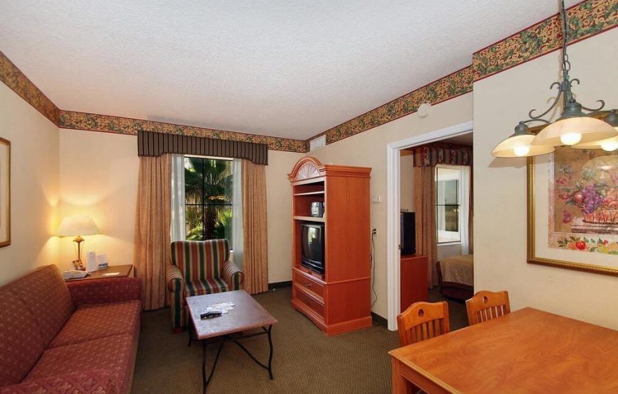 Set near Interstate 4, this modern, all-suite hotel is 0.5 miles from Titanic: The Experience, and 2.3 miles from Universal Studios Florida.The warm 1- or 2-bedroom suites feature kitchens, separate living areas with pull-out sofas, and high-thread-count linens, plus TVs and free WiFi.Continental breakfast is complimentary. There’s an outdoor pool and a hot tub, a fitness room, and a sport court, as well as laundry facilities and meeting space. Other amenities include off-street parking and a social hour (Wednesdays and Fridays).